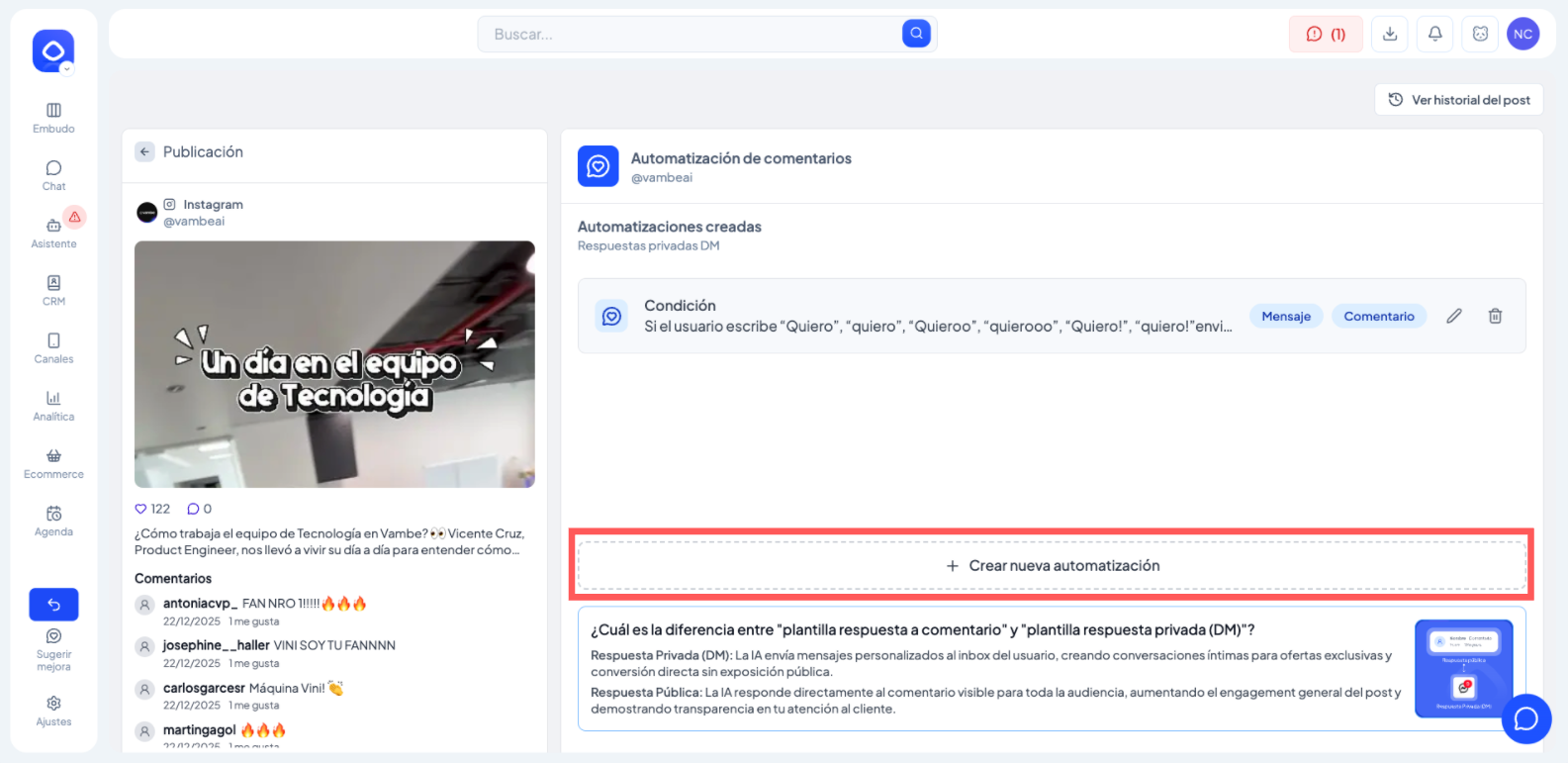 En este artículo aprenderás cómo enviar mensajes automáticos por Instagram Direct a todas las personas que comentan tus publicaciones, logrando que entren directamente a tu embudo en Vambe y, si lo deseas, responder también el comentario público en la publicación.