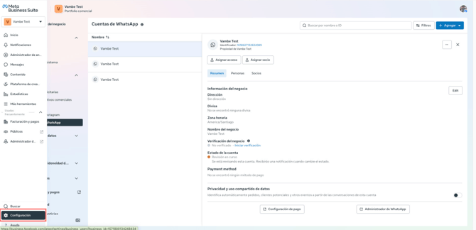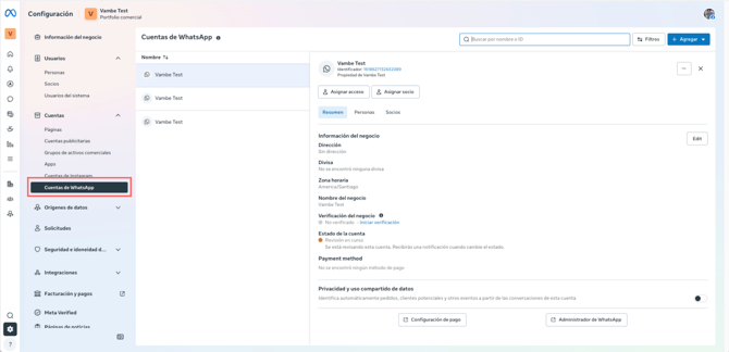 Para poder enviar plantillas (HSM templates) y campañas a través de WhatsApp API, es obligatorio asociar un método de pago válido en Meta. Además, configurar correctamente la foto, el nombre para mostrar y la descripción del perfil mejora la experiencia del usuario y aumenta la confianza de tus contactos.