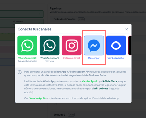 Dentro del listado de canales disponibles, haz clic en Messenger.