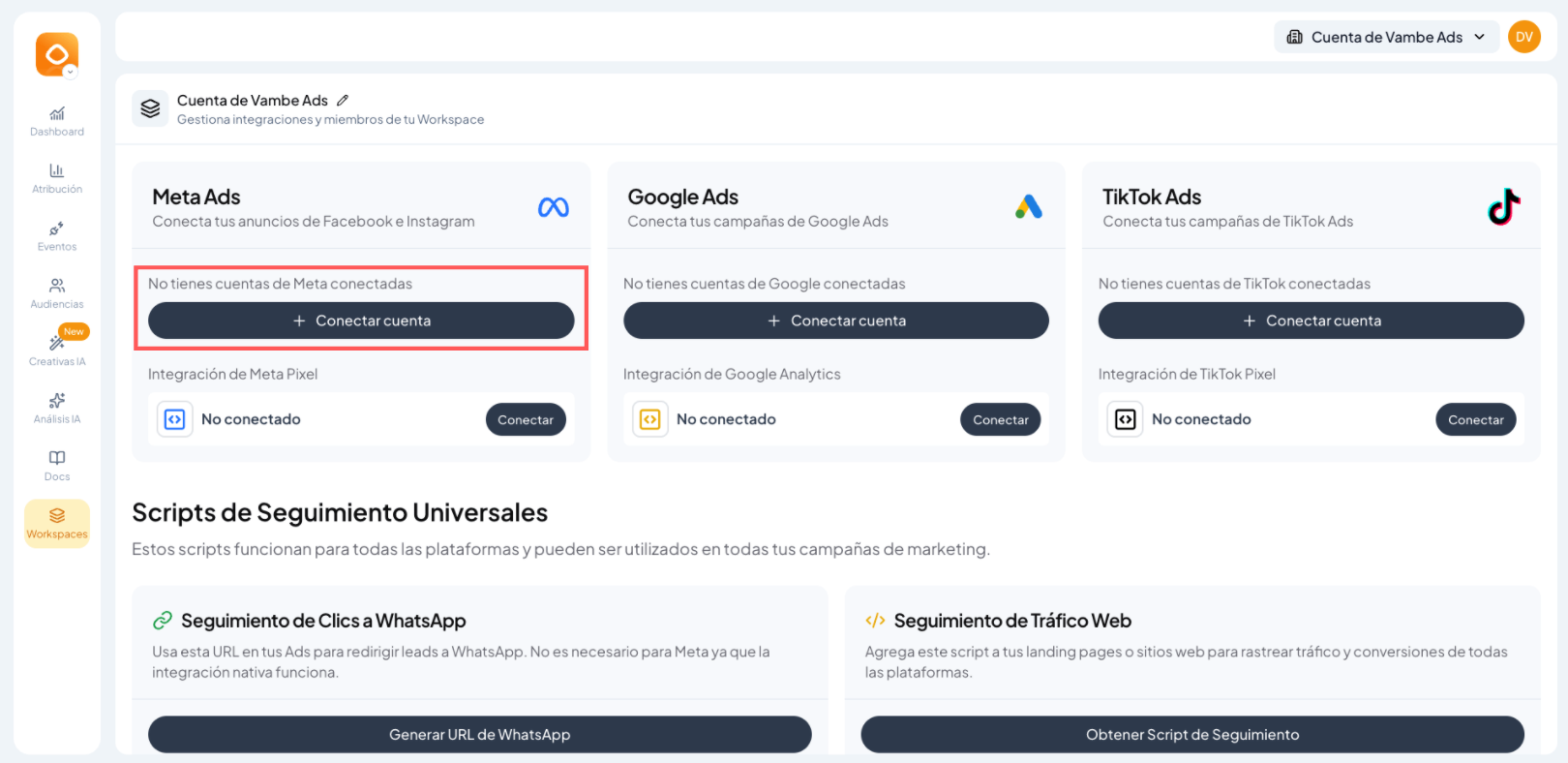 Dentro de Workspaces, dar click en conectar cuenta en Meta Ads