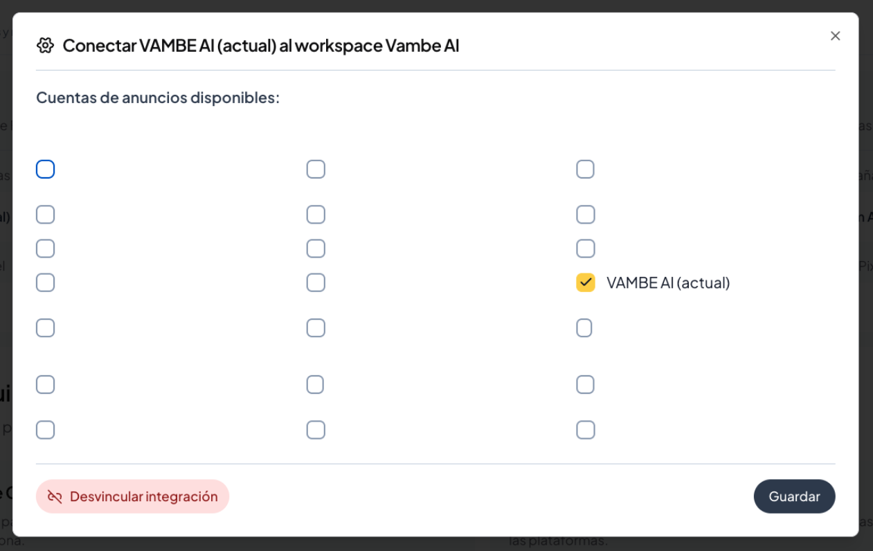 Ya de vuelta en Vambe Ads, haz clic en Seleccionar cuentas publicitarias.