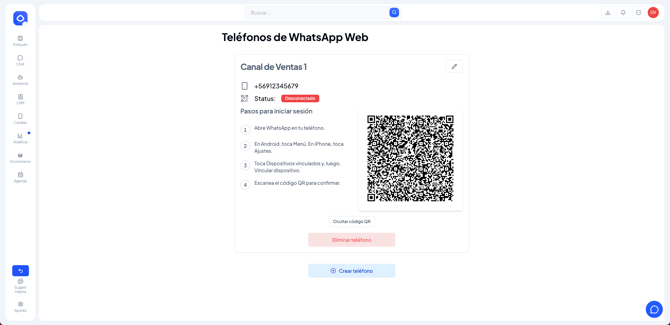 Escanea el código QR que aparece en pantalla utilizando la cámara de tu teléfono, siguiendo el mismo proceso que usarías para WhatsApp Web. (Código dinamico cambia cada 15 segundos).