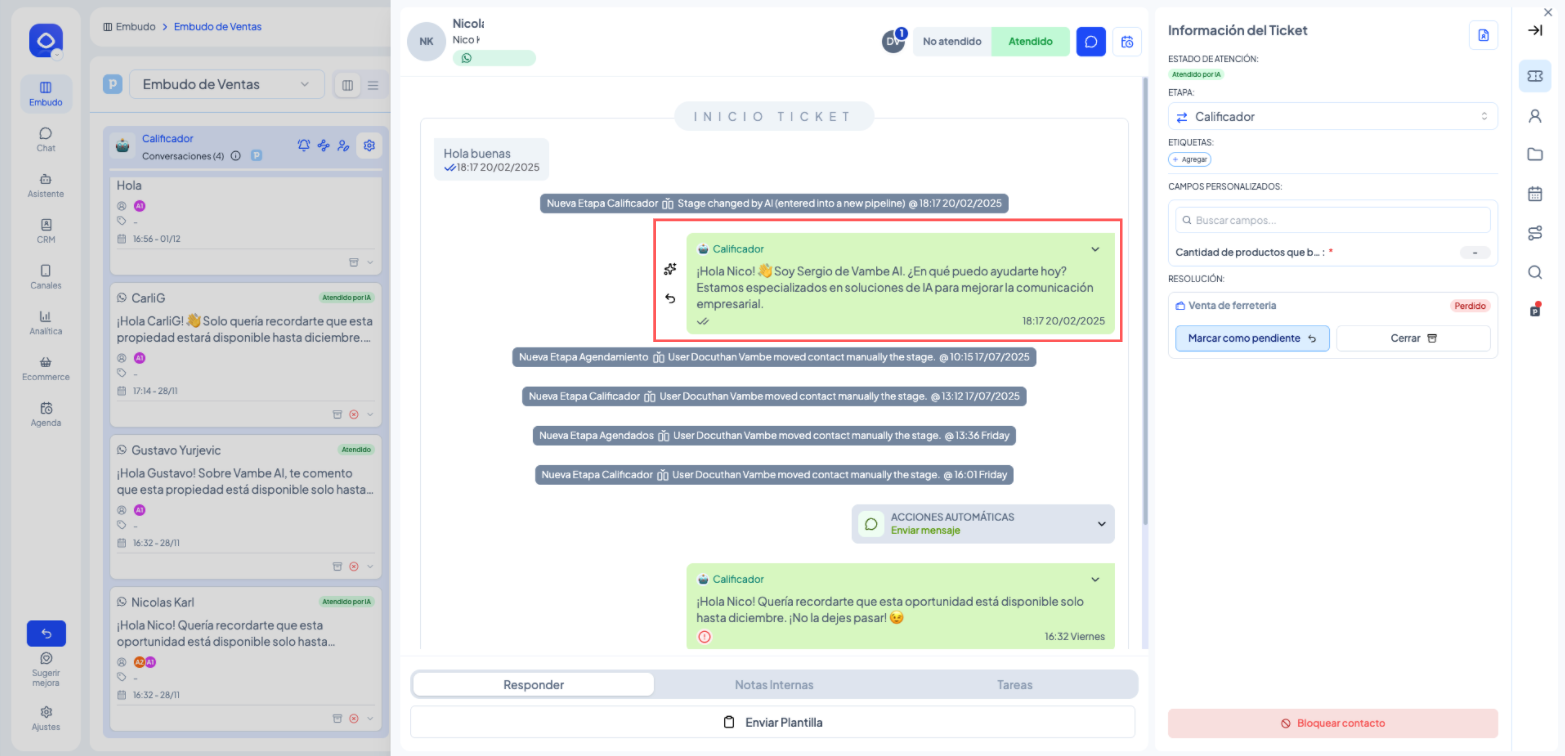 Dentro del ticket, identifica el mensaje enviado por la IA que deseas corregir.
