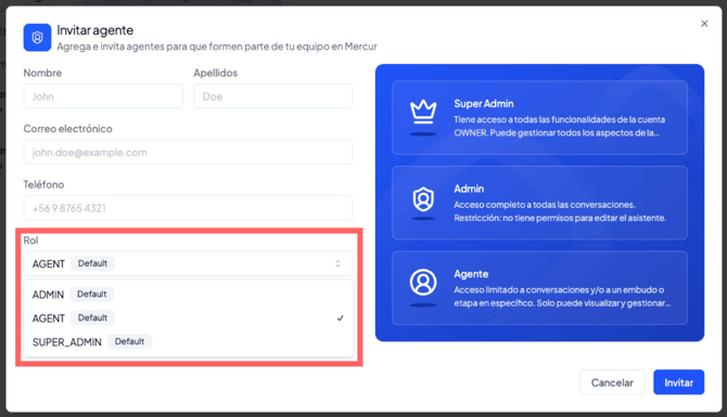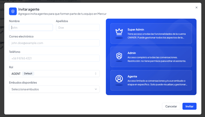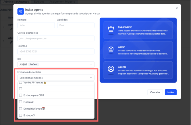 Si el rol seleccionado es Agente o Administrador, deberás especificar a qué embudos tendrá acceso dicho usuario.