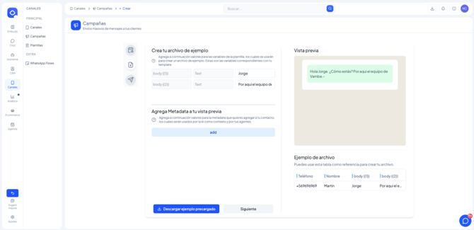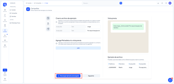 En esta pantalla verás un botón Descargar ejemplo precargado, que genera un archivo ya formateado con las columnas necesarias para tu plantilla.