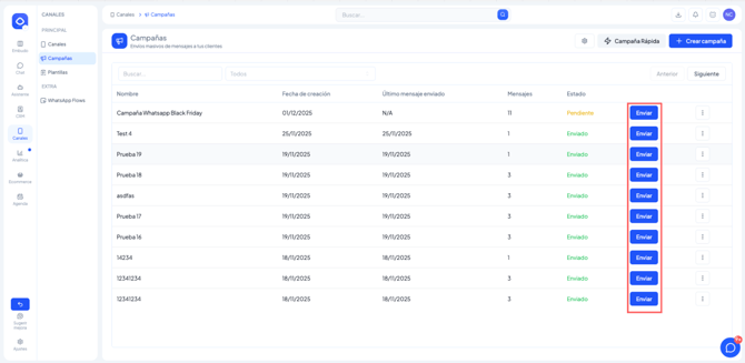 En la barra lateral izquierda, ingresar a Canales y luego en Campañas.