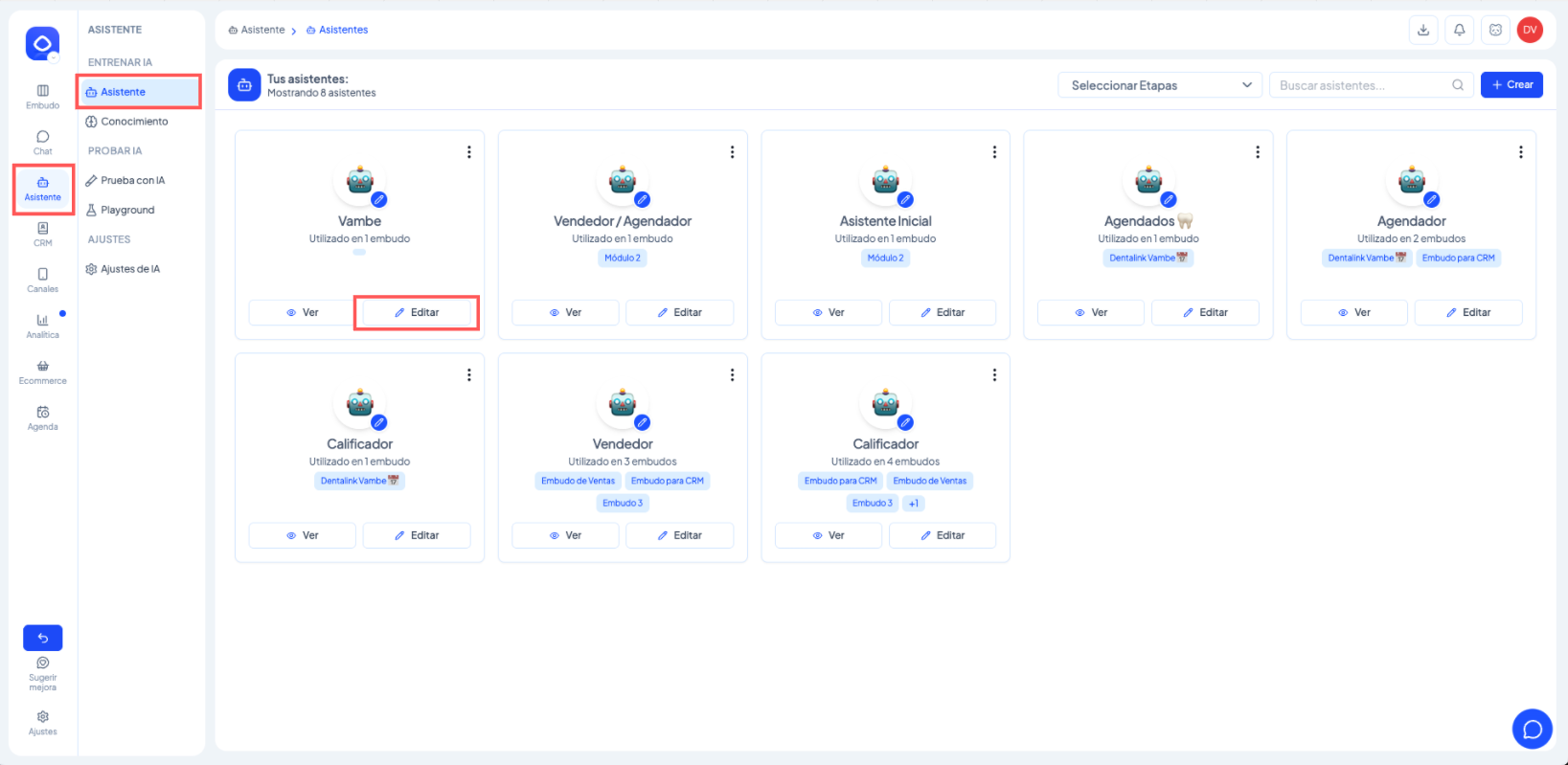 En Vambe existen dos formas de acceder a un asistente de Inteligencia Artificial, dependiendo de si ese asistente está asignado a una etapa del embudo o si es un asistente independiente que no está vinculado a ninguna etapa.
