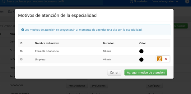 Solo los motivos de atención creados y activos dentro de una especialidad serán visibles para el agendamiento.
