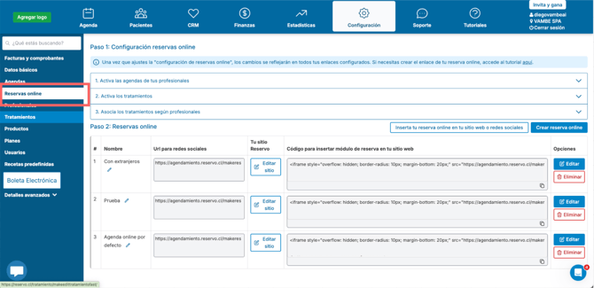 Luego selecciona Reservas online en el menú lateral izquierdo.