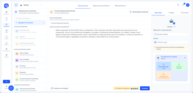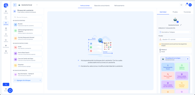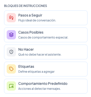 Los Bloques de Instrucción guían el comportamiento del asistente. Funcionan como reglas operativas que determinan cómo debe actuar la inteligencia artificial frente a diferentes escenarios y situaciones dentro del embudo.