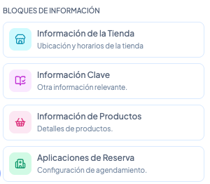 Los Bloques de Información proporcionan los datos que el asistente utiliza para responder correctamente. Representan la base de conocimiento del asistente y son fundamentales para que pueda entender el negocio, entregar información precisa y ejecutar acciones como buscar disponibilidad o responder preguntas frecuentes.