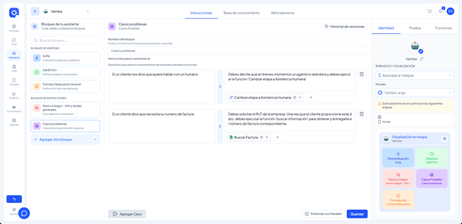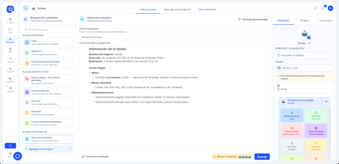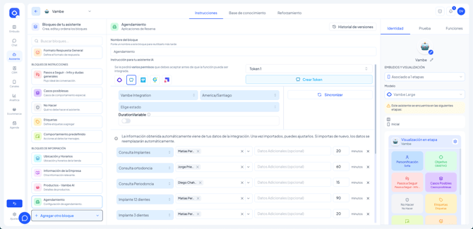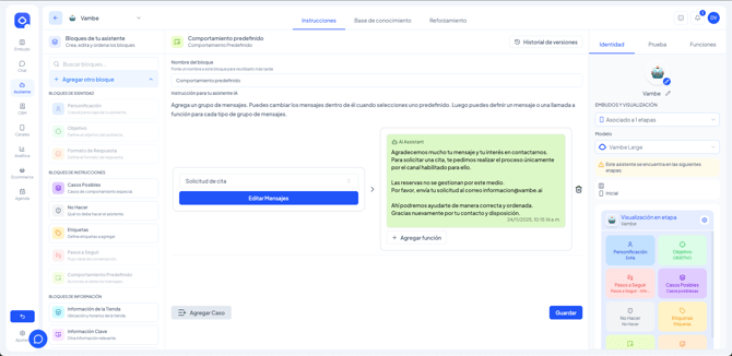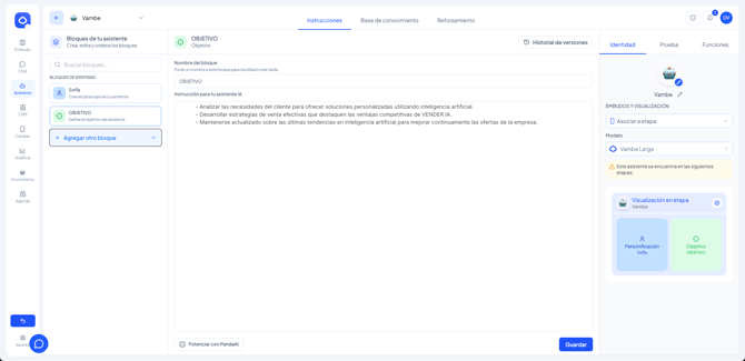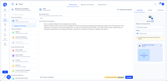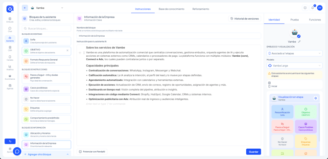 Un asistente de inteligencia artificial en Vambe es una configuración compuesta por múltiples bloques que, en conjunto, definen cómo piensa, responde, actúa y procesa la información un asistente dentro de un embudo.