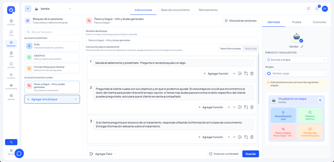 El bloque de Pasos a seguir es uno de los más importantes, ya que define la secuencia operativa que el asistente debe ejecutar mientras conversa con el cliente.