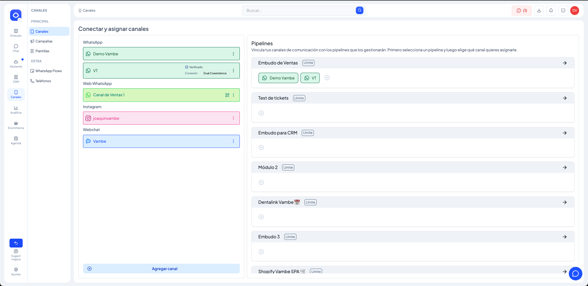 Solo una vez vinculaste el canal a Vambe, debemos verificar que el canal este correctamente conectado a nuestro Embudo adecuado.